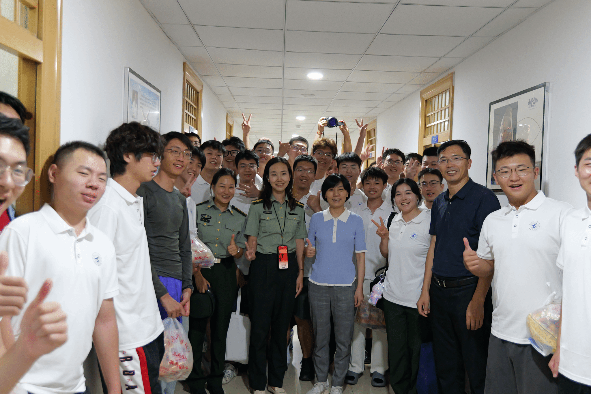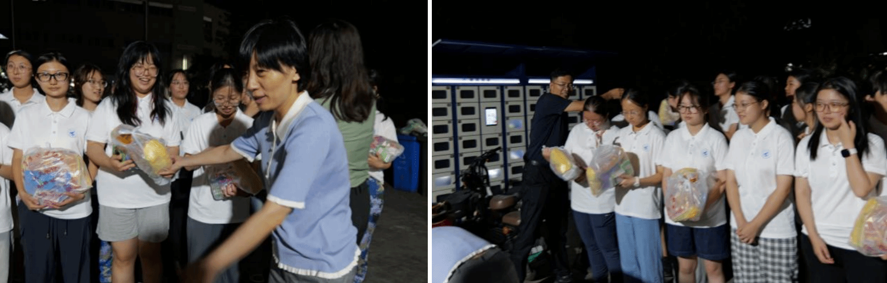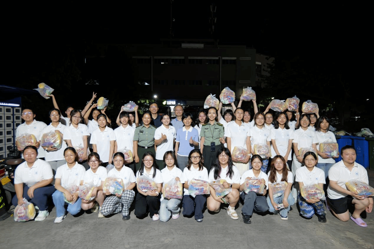 随后,公司领导一行来到女生宿舍区。刚刚抵达,便被早已等候在宿舍楼下的同学们热情地围住。领导们将一份份精心准备的慰问品送到同学们手中,还特别暖心叮嘱大家“记得一定要按时吃早餐”。同学们也主动就课程安排、专业学习及未来发展方向等问题,与老师们积极交流,获得了细致解答,为大家明晰了目标、提振了信心。临别时,同学们自发地将领导老师们围在中间,笑容洋溢,用快门定格了这个满是笑容与温情的夜晚。