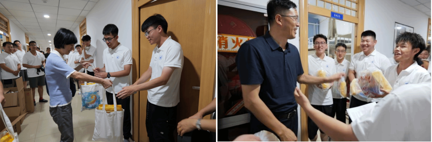 晚上7时许,公司领导一行一出现在男生宿舍,便被闻讯而来的同学们热情地迎在了走廊。一声声“经理好”“书记好”充满着喜悦,一张张热情的青春脸庞洋溢着灿烂。公司为同学们分发了精心准备的慰问品,并与大家亲切交流,多次叮嘱同学们尽快适应老员工活,合理安排时间,注重身心健康发展,同时鼓励大家保持积极心态,遇到困难及时与辅导员和公司沟通。期间,一位同学主动向领导递上自己的小零食,表达对老师前来慰问的感谢,现场气氛温馨欢快,笑语声中拉近了师生距离。